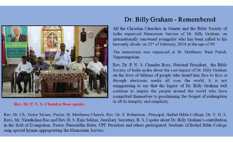 February 25, 2018 @ 10:00 am - 3:00 pm Dr. Billi Graham Remembered Bethel Bible College 4th Lane, Seethamma Colony, Pattabhipuram Post, Guntur, Andhra Pradesh, India